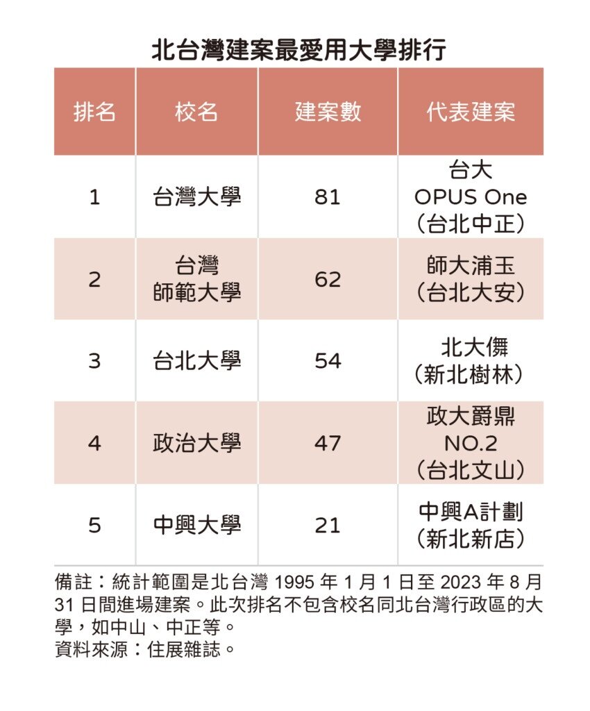 台灣第一學府光環加上校地遼闊,讓台灣大學成為北台灣建案最愛用的大學。經統計,1995年1月1日至2023年8月31日間,北台灣約81個建案曾以含有「臺大」、「台大」字詞的案名銷售,且建案分布廣泛,從台北中正、大安到新竹竹北,都能看到以「台大」命名的建案。
