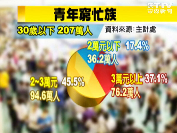 你是「月光族」?「窮忙族」?還是「青貧族」?根據行政院主計總處的調查,去(100)年30歲以下年輕人的平均年所得為41.6萬元,還不如15年前的水準,扣掉稅費、利息支出等非消費支出後,每月平均可支配所得還不到3萬元。