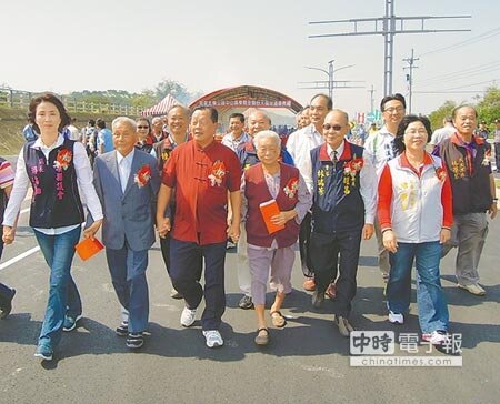 苗栗北橫公路中山高東側至頭份大橋段14日舉行完工通車典禮,縣長劉政鴻牽著長壽公、婆在通車路段齊步走,見證新路段完工。(江詩筑攝)