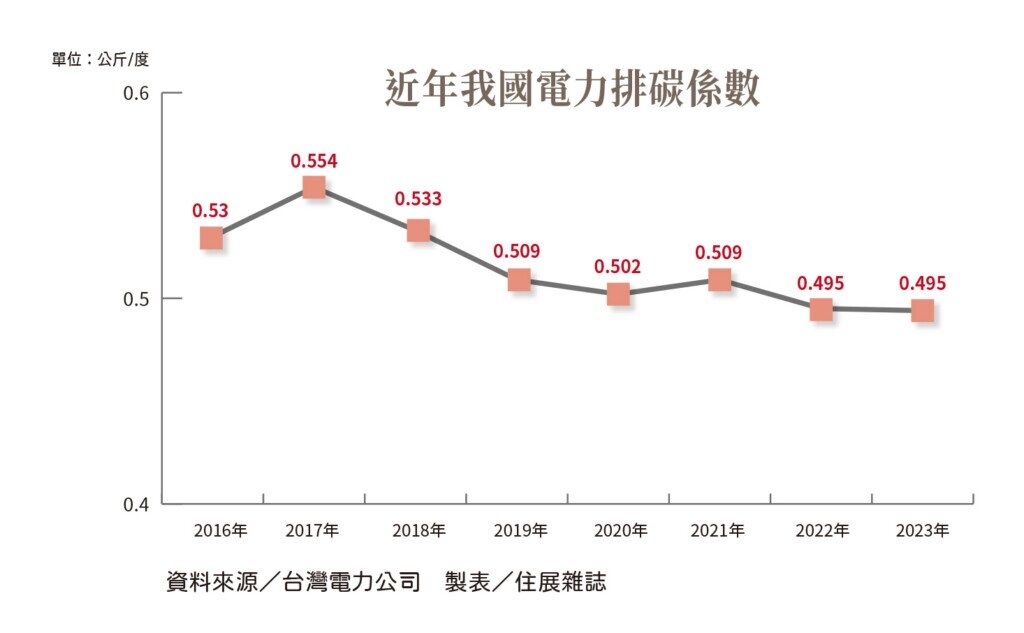 由於減碳與發電高度相關,根據經濟部能源署2023年度的電力排碳係數資料顯示,每度電力將排放約0.5公斤的二氧化碳,政府為達減碳目標,將調整電價作為具體策略的選項之一,此舉也可能進一步導致各建設所需成本產生綠色通膨。