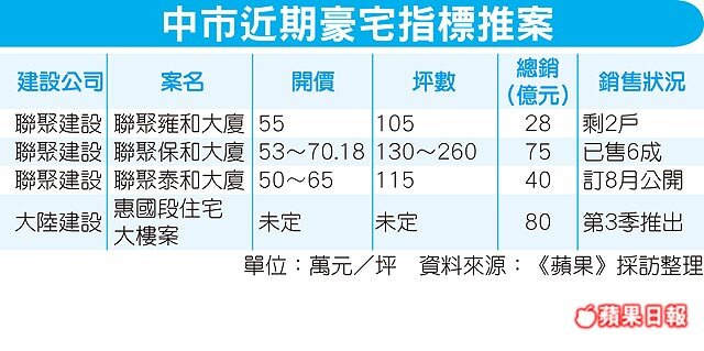 政策不斷打壓豪宅,但台中7期和國家美術館一帶仍屬豪宅聚集之地,近期7期豪宅案包括聯聚建設「聯聚雍和大廈」等3案接連上場,年底前還有宏泰建設「宏泰帝寶」、大陸工程的7期住宅大樓案等,業界預估台中7期每坪價格上看70萬元。
