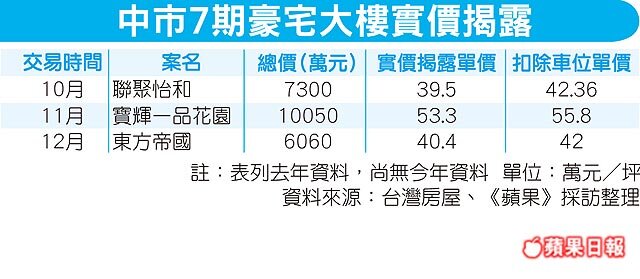 從前年奢侈稅、去年實價登錄政策上路後,豪宅開價趨於平實,當時每坪曾喊到68萬元的高樓層產品,逐步降到約55萬元。去年實價揭露後,7期豪宅的成交行情一一曝光,目前以「寶輝一品花園」暫居總價、單價雙冠王,每坪扣除車位後55.8萬元,也是7期區內唯一的大樓「億元戶」。另一豪宅「聯聚方庭大廈」曾在去年5月實價成交每坪52.3萬元,扣除車位後每坪57萬元。