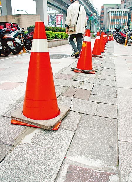 新工處副總工程司李文芳說,光華商場前人行道原本禁停車輛,但因隔壁台北資訊園區動工,該空地不再供停車,機車轉停至人行道上,偏偏早期施作時底層僅填沙,並未夯實,川流不息的機車反覆輾壓,地磚出現裂隙、殘破不堪。