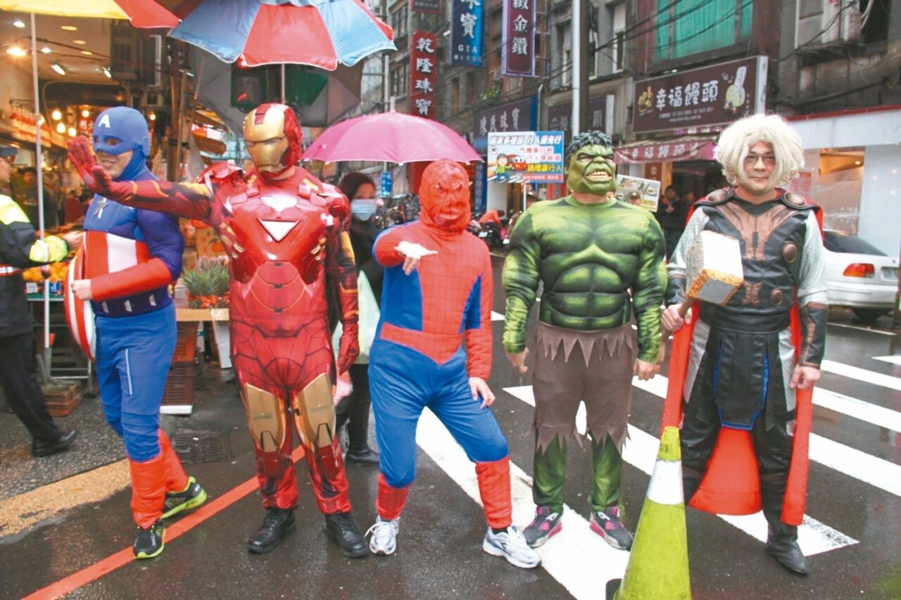 「媽媽,他是蜘蛛人耶」,小朋友陪家人到市場採買年貨,看見電影中英雄角色,興奮地又叫又跳,搶著上前合照。基隆市警局交通隊警員昨早9時許身穿道具服,變身復仇者聯盟英雄,模仿角色經典手勢,逗趣活潑的模樣相當吸睛。