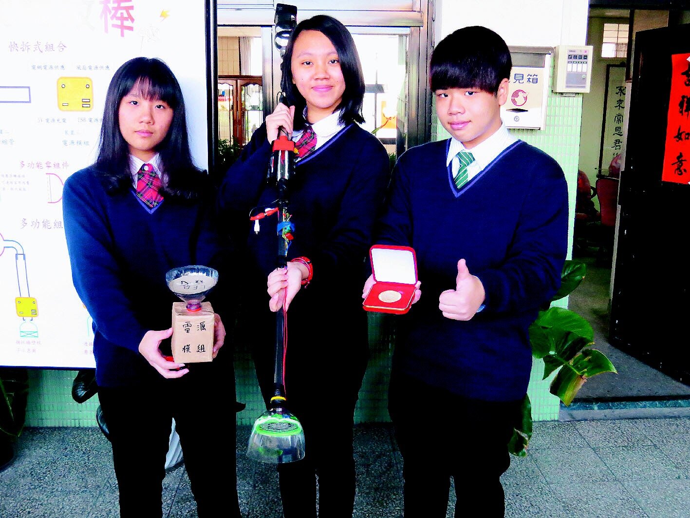 安中高一數理實驗班學生胡郁微、馬爰及劉曜全有感於基隆蚊子多,利用壓克力透明管、抽氣風扇及通電鐵網自製「吸式電蚊棒」,創意且有趣的發明獲得評審青睞,獲得中學組金牌獎。