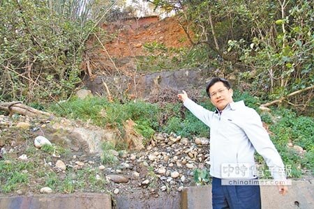 台中市外埔區馬鳴埔邊坡崩塌離民宅僅2步距離,崩落高度達30公尺;立委林佳龍昨日為民請命。(記者陳世宗/攝影)