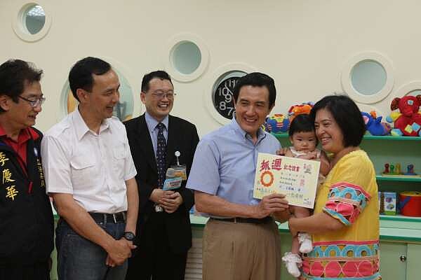 總統 馬英九由市長朱立倫陪同視察了解新北市領先全國所推出的全國第一座「新北市汐止忠厚公共托育中心」。(記者黃村杉攝)