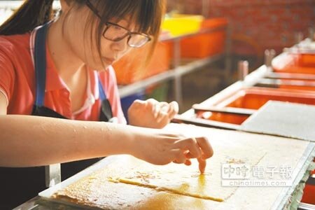 客家桐花祭期間,埔里廣興紙寮推出桐花手抄紙,讓遊客DIY,做出精緻的手工明信片與書籤。(廖肇祥攝)