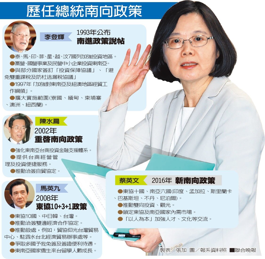 前總統陳水扁的南向政策只剩口號,未有實際作為;馬政府雖未沿用南向政策,但任內與東協經貿量、人員往來數量等,持續上升。