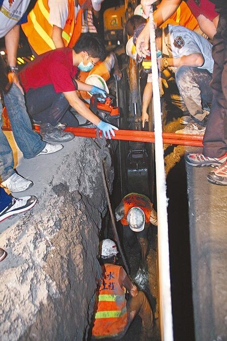 消防隊昨日晚間6點半獲報到場,只見深達3米、寬僅80公分的狹窄工地中,1名工人被土石掩埋,只露出頭部,已無生命跡象;消防隊員楊晉芳心急如焚,與2名工人一同進入下水道清除土石,在陳某腰部綁上繩索,希望盡快將他拉上來。