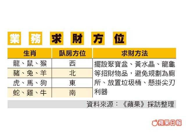 鄭雅勻指出,若從事業務工作,求正財方位則為個人桃花位,即代表人緣、人脈,建議可於臥房生肖桃花位擺設聚寶盆、黃水晶、龍龜等招財物品,以增事業運,切忌將上述方位規劃為廁所或放置垃圾桶。