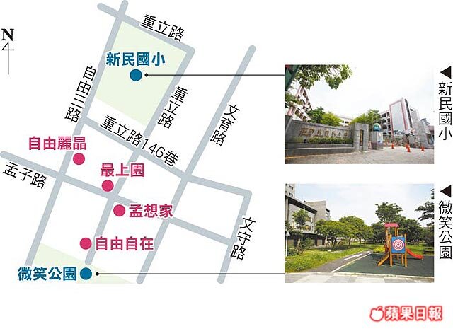吳玉玲說,自由三路沿線消費機能佳,中古社區「自由麗晶」位於自由三路、近孟子路,周邊商店林立,步行至自由黃昏市場與新民國小都僅3分鐘,屋齡6年、坪數35~48坪、3~4房格局,每坪13~15萬元。
