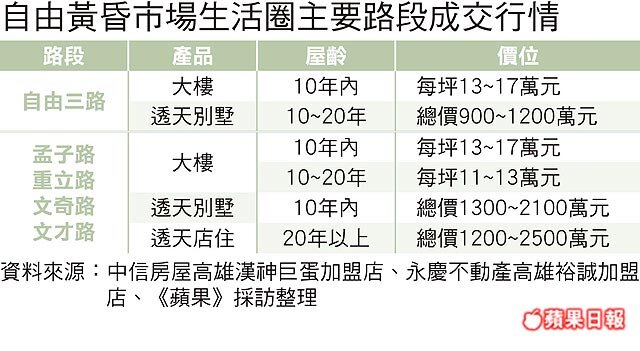 休憩與採買機能並重,一直以來都是購屋族最理想的選擇,自由黃昏市場位於左營區,為高雄市最大的黃昏市場,採買機能便利。周邊大樓與透天產品都有,其中以屋齡10年內大樓詢問度最高,每坪13~17萬元。部分屋齡10年內別墅,鄰近微笑公園,總價1300萬元起,較受換屋族青睞。
