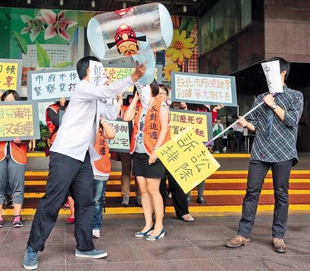 華光社區居民及聲援民眾,10日在市府前上演行動劇,希望解決拆遷後住的問題。(圖/王英豪攝)