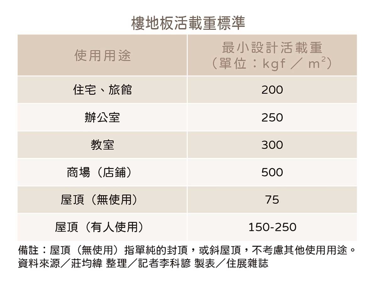 最常見的違建莫過於頂樓加蓋,許多五層樓的老公寓會加蓋至六樓甚至七樓,莊均緯強調,一般住宅的樓地板最小活載重為200kgf/m2,而屋頂則為150kgf/m2,雖然這些數字看似充裕,實際上只要進行加蓋,就勢必會超出原先的結構設計承重。(編按:活載重是用以模擬該樓層可乘載的重量,包括建築物室內人員、家具、設備、儲藏物品、活動隔間等。)