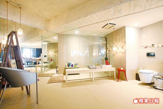 蝦米!都是玻璃?那上廁所的時候怎麼辦?別擔心,有布簾可以遮住玻璃。原本,這間浴室玻璃屋是想採用電漿玻璃,按鈕一按,清玻璃就變成霧面,外面看不到裡面,可是預算要多將近200萬元。而玻璃牆的鐵件,原本想用不鏽鋼鍍鈦,做出GUCCI旗艦店的那種時尚光澤,也因為預算比想像中多3倍而作罷。談起這件事,包益民直呼:「氣死我了。」