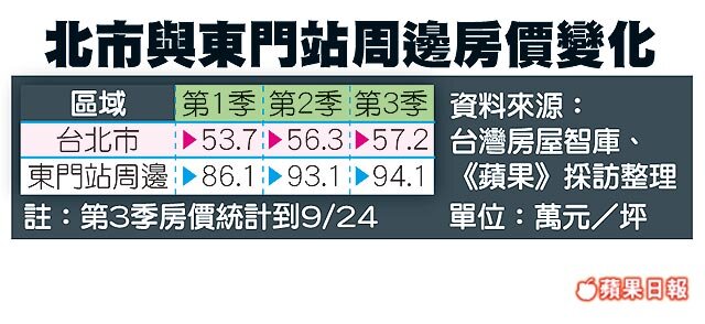 台灣房屋智庫副執行長劉怡蓉表示,捷運向來是房價抗跌保值一大指標,9月底將通車的捷運東門站也不例外。據台灣房屋智庫統計,今年第3季房價發現,北市每坪57.2萬元,較第1季增6.5%,東門站周邊每坪94.1萬元,較第1季增9.3%,明顯高於北市漲幅。