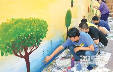 草屯療養院附設生活旗艦店社區復健中心為讓學員在參與社區服務過程中,重建自信心與增進人際互動,昨日帶領精障學員前往草屯聖教會,將愛繪入社區,幫教會老舊外牆完成彩繪,讓學員透過服務獲得成就感與快樂。