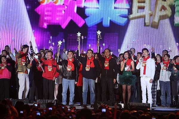 總統馬英九與市長朱立倫、議長陳幸進、臺北市長郝龍斌、立委林鴻池、江惠真、雙北市議員及藝人等,共同點亮耶誕樹頂端的希望之星許願祈福。(記者黃村杉攝)