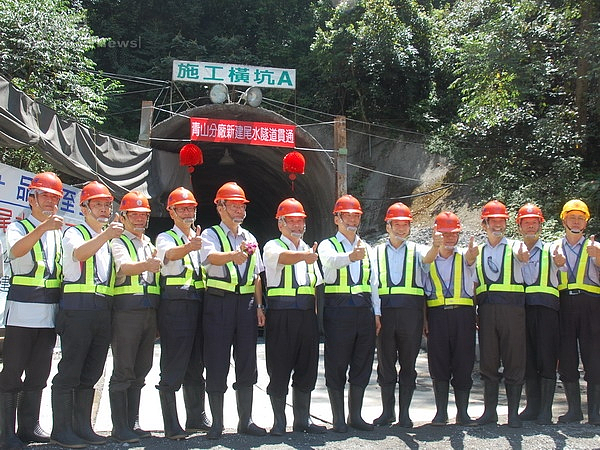 台電大甲溪發電廠青山分廠整體復建工程進度已過半,工程人員歡慶尾水隧道全線貫通。(記者黃玉鼎攝)