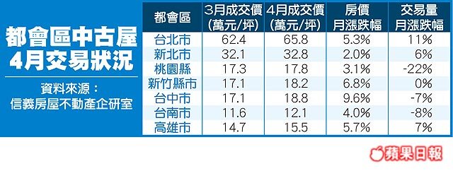 根據信義房屋統計,台北市4月中古屋交易量較3月增加11%、新北市量增6%,高雄市亦增加7%,但桃園卻大幅減少22%,為買氣降溫最多區域。但平均房價則呈現全面上升,平均較3月漲2%~9.6%,以台中漲9.6%最高,北市每坪則漲至65.8萬元,較3月成長5.3%。