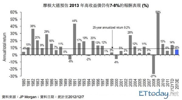 蔡宜君根據摩根大通(JP Morgan)報告表示,預估2013 年高收益債市全年報酬率可望上看8%,新興市場美元債亦將有7至8%以上漲幅,預期在資金行情續熱的情況下,高收益債和新興市場債可延續今年的表現,明年持續為市場關注的焦點。