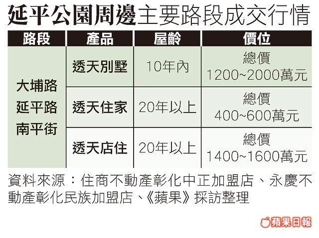 延平公園是彰化市主要的公園綠地與發展核心,也是當地居民重要的休閒場所,目前該區周邊以20年以上的透天住家為主,總價400萬元起,部分10年內的別墅,多分布在南平街、延平路等路段,主力總價1200~2000萬元。