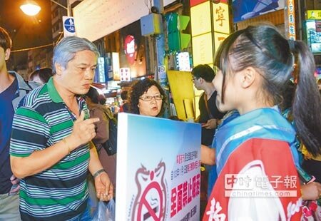 全國首創無菸夜市。寧夏夜市即日起每晚6點至隔日0點全面禁止吸菸,違者可罰2000至1萬元罰鍰;圖為禁菸志工正向民眾宣導夜市禁菸。