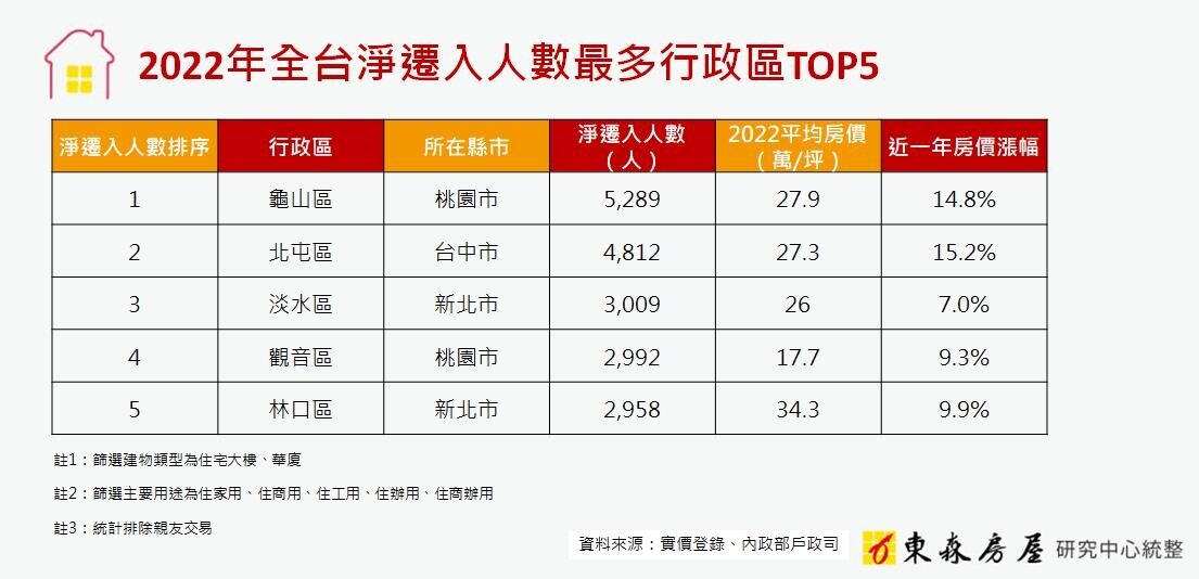 眼看蛋黃區的房價和生活成本居高不下,不少民眾紛紛「用腳投票」,離開市中心搬到更加宜居的地方。東森房屋研究中心彙整內政部戶政司資料發現,2022年全台淨遷入人數最多的行政區是桃園市的龜山區、淨遷入5,289人,其後分別是北屯區(4,812人)、淡水區(3,009人)、觀音區(2,992人)和林口區(2,958人)。