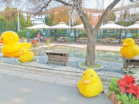 今年公館耶誕季將最夯的黃色小鴨也搬到自來水園區,圖中較小隻的小鴨到了夜晚會亮燈,十分可愛。(記者邱文秀/攝影)