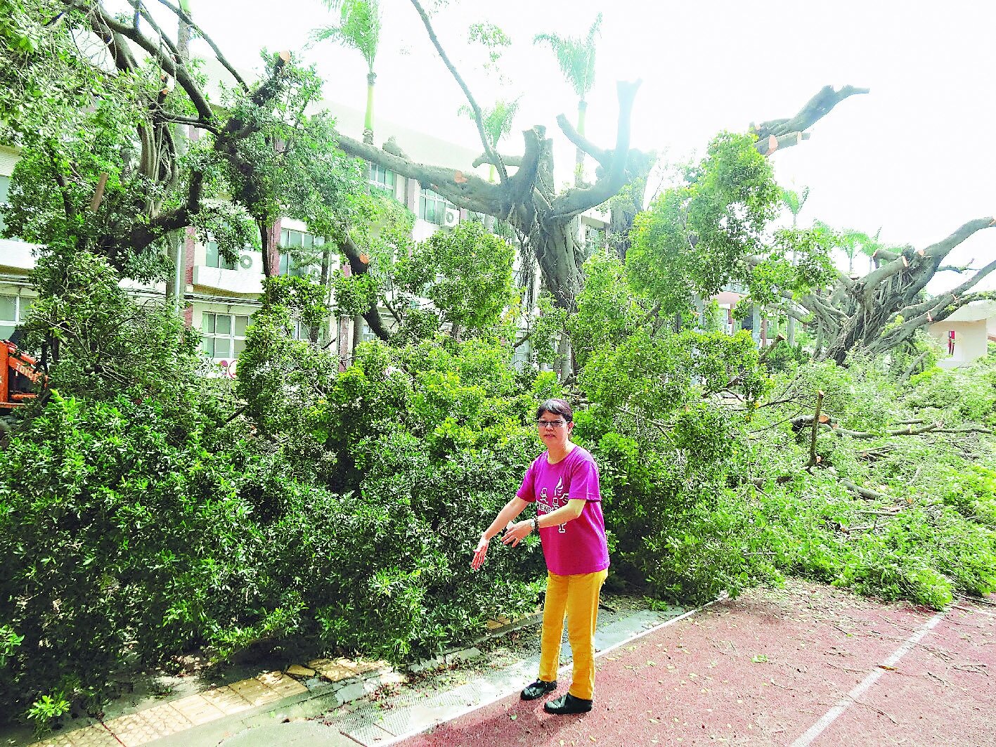 嘉職雇工修剪校園樹齡一甲子大榕樹,遭居民投訴砍樹,總務主任陳美惠指樹根隆起破壞新鋪設的PU跑道。(記者魯永明/攝影)