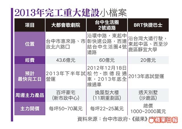 台中市今年預定有大都會歌劇院、台中生活圈2號道路與BRT快捷巴士等重大建設將完工,歌劇院周邊以135坪以上豪宅為主。專家預估完工後,面歌劇院豪宅可望站穩每坪60萬元。台中生活圈2號道路沿線以11期推案較熱,多為45~70坪換屋型大樓,每坪開價22~25萬元。