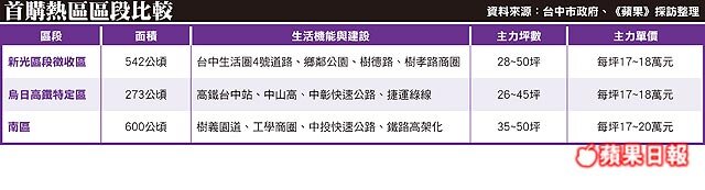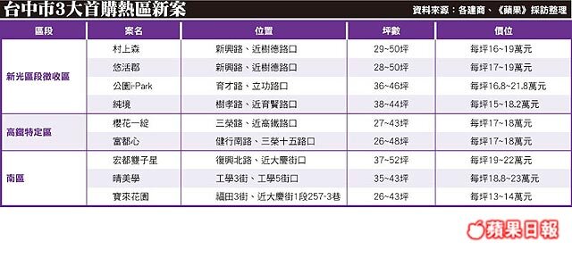 台中市首購大樓買氣發燒,太平新光區段徵收區與烏日高鐵特定區首購大樓推案持續加溫,新案清一色為2~4房首購大樓,每坪17~18萬元,是首購大樓推案最熱的區段,南區以35坪以上、3房為主,主力單價18~20萬元,專家預估,南區、新光地區未來房價可望站穩2字頭,高鐵特定區明年推案量更上看50億元。