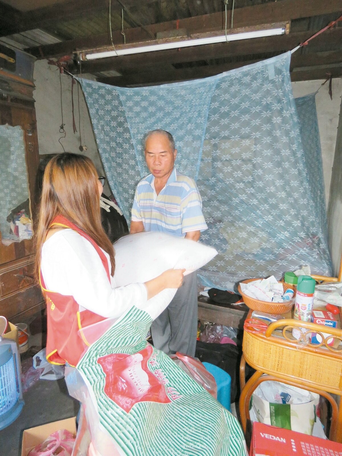 三義鄉64歲曾德球去年中風後行動不便,他獨居在勝興村一間矮房內,因屋齡老舊天花板多處破損,逢雨就漏,華山基金會三義愛心天使站號召善心人士來當「一日志工」,協助他有安穩舒適的家。