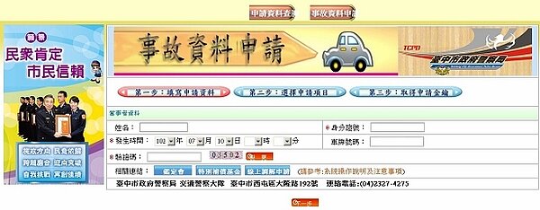 台中市政府警察局交通事故為民服務系統今年初上線,因可減少車禍當事人申請資料時的舟車勞頓及等候時間,只要在事發5日後即可上線申請現場圖、照片,7日後申請研判表,可謂全國最佳。推出至今不到半年,線上申請人數已突破萬人。