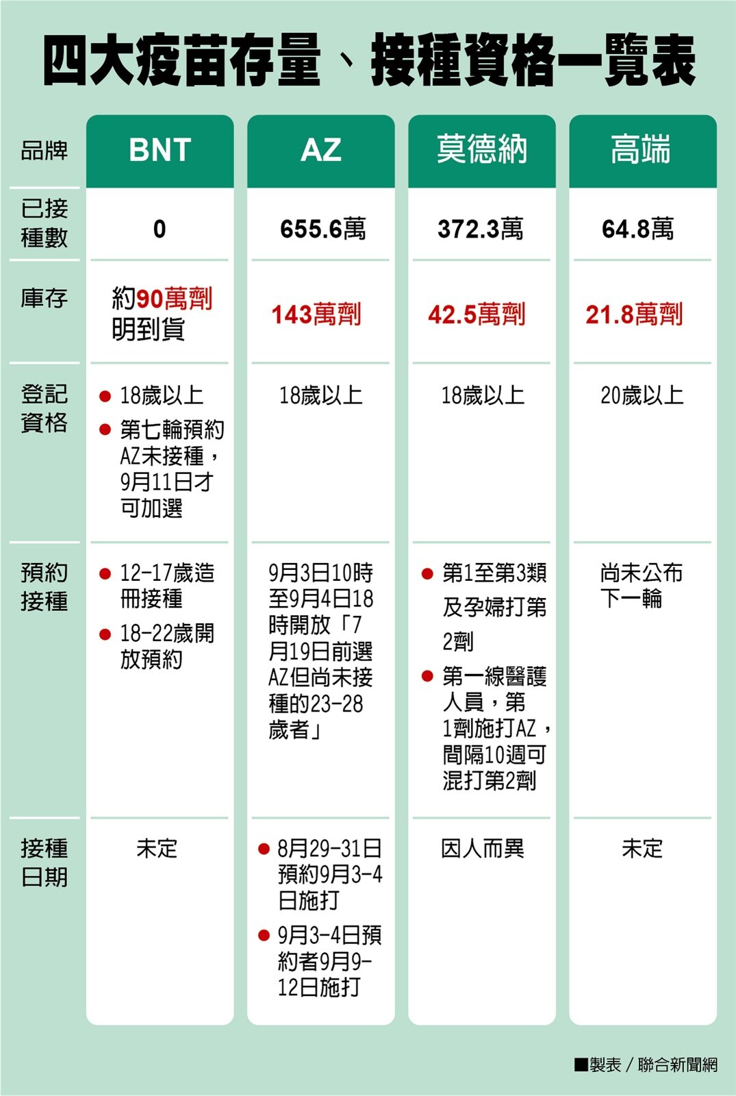 9月2日BNT到貨後,國內四大廠牌疫苗庫存量以AZ最多,還有143萬劑,其次則是新到貨的BNT約90多萬劑,莫德納42.5萬劑排第三,高端最少,僅剩21.8萬劑。