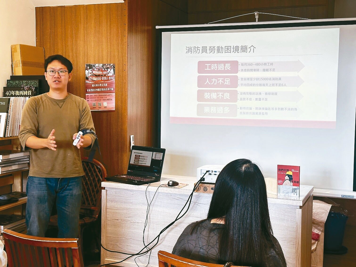 明揚大火事發逾1個月,屏東縣時遇書店22日邀消防員工作權益促進會顧問朱智宇(左)分享消防員改革背後行動。圖/記者劉星君攝影