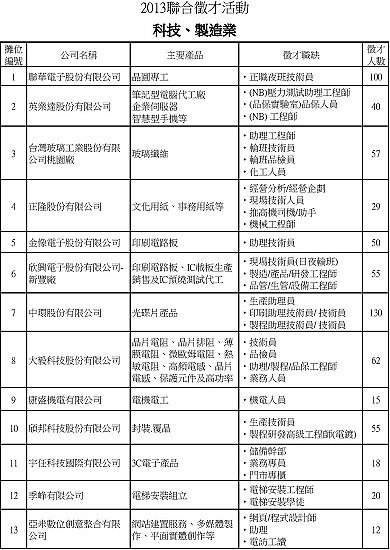 三重就服站長林澤州表示,這場聯合徵才活動,聯電等科技大廠都釋出超過百名職缺,聯電主要徵求正職技術員,英業達徵求NB工程師、助理工程師、品保人員,光碟大廠中環也徵求印刷、製程技術員等。