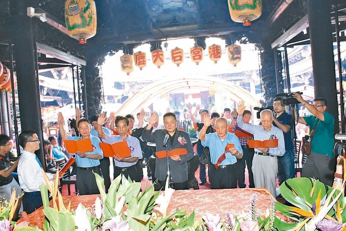 張偉東以109票獲全數信徒代表支持當選委員,隨後改選管委會,再以15票蟬聯本屆主委,昨天與14位委員、5位監事在天后宮正殿媽祖駕前宣誓就職。