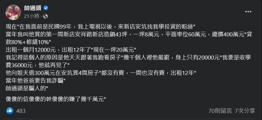 帥過頭指出,該名粉絲是幾千名學員中最窮的,「身上只有20000元,我要是收學費3.6萬,他就再見了。」他向姐夫借300萬元買安坑4間房子,目前出租12年一間都沒有賣,「當年他爸爸要告我詐騙……傻傻的信傻傻的幹傻傻的賺了幾千萬元。」