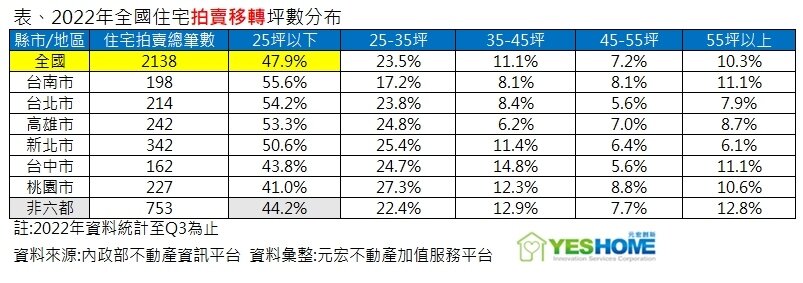 元宏不動產加值服務平台彙整內政部資料發現,去年前3季全國住宅拍賣移轉的各坪數帶中,25坪以下住宅的交易就佔了47.9%,直逼5成。
