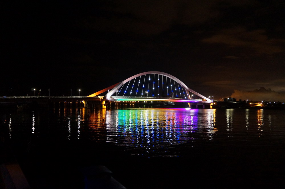 進德大橋增加夜間光影變化後,夜間站在東港溪畔河濱步道可觀賞利用燈光美化橋梁弧形線條,搭配橋面兩側型鋼造型及燈光控制呈現出多彩變化,在水面上畫出一幅美麗的光影水墨畫,不論從東港溪堤岸、河濱公園,或未來新建的候船室二樓觀景平台遠眺欣賞燈光秀,都有不同味道。