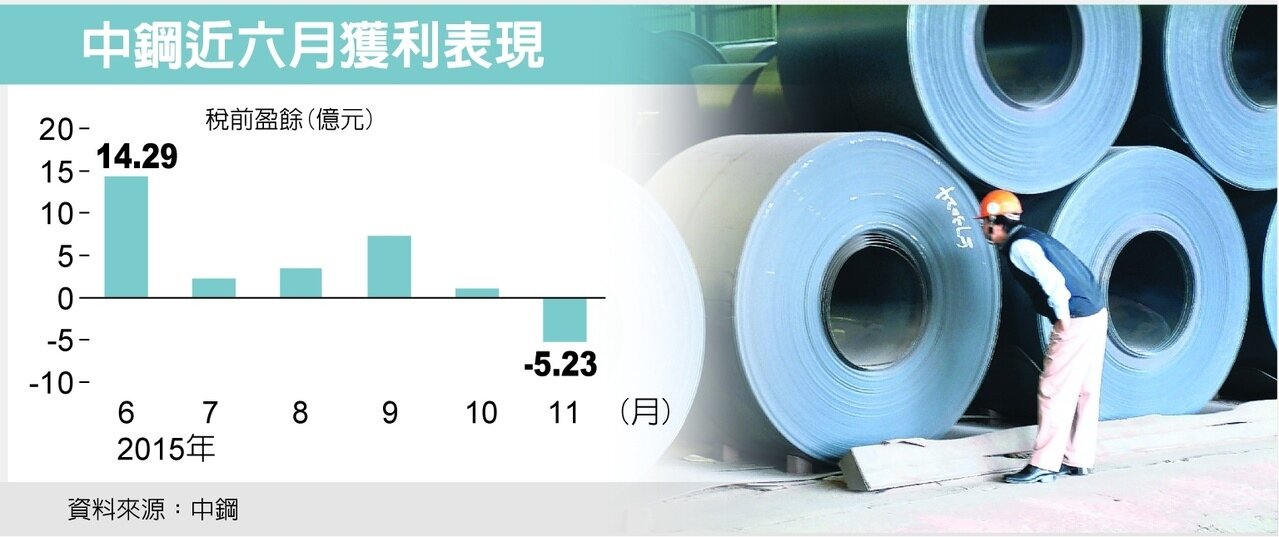 中鋼11月單月合併稅前虧損5.23億元,是2012年2月以來首見虧損,也是自2013年採合併報表以來,第一次出現赤字。並使今年前11月合併稅前盈餘減至114.88億元,每股稅前盈餘約0.73元。