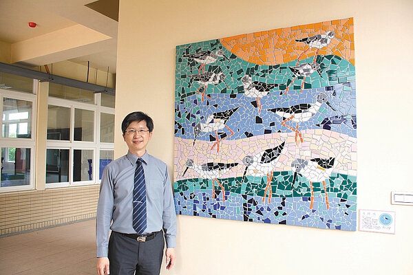 觀音鄉富林國小校長魏吉宏學美術出身,與學生合力完成的水鳥馬賽克拼貼壁畫。 (圖/楊德宜攝)
