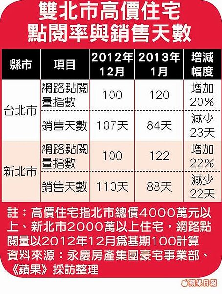 永慶房屋首席房產顧問葉國華協理說,因農曆年前購屋旺季及台幣升值潮帶動下,高資產人士較積極看房、買房,出價速度也加快,買氣已漸回暖,如台北市總價4000萬元以上、新北市2000萬元以上產品,1月網路點閱率各較上月增加20與22%,銷售天數則減少23與22天。