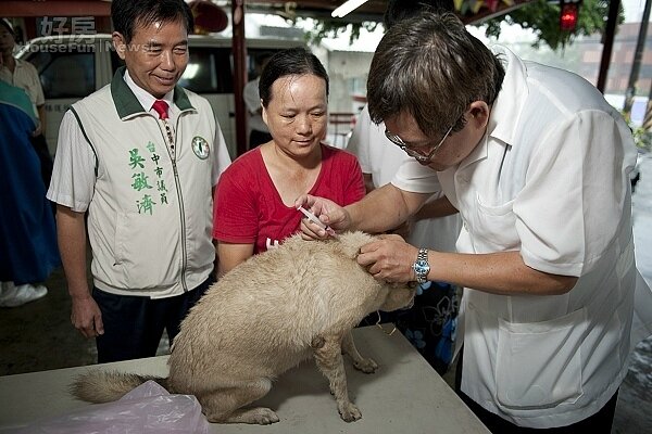 台中市動保處29日為鐵砧山周圍岷山、頂店及鐵山等里,免費施打狂犬病疫苗,雖適逢康芮颱風過境傾盆大雨,仍阻擋不了寵物主人的愛心,紛紛穿上雨衣帶著愛犬前往注射。為了確保狂犬病危害,市議員吳敏濟建議動保處擇日再增辦一次注射活動,以達到防疫的成效。