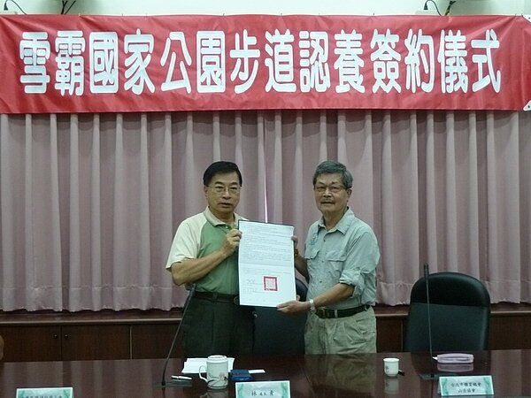 雪霸處為讓認養活動更具意義,於五日上午十點在雪霸處第一會議室,和台北市體育總會山岳協會共同舉行簽約儀式及意見交流,儀式中並有中華民國健行登山會派員共同見證。