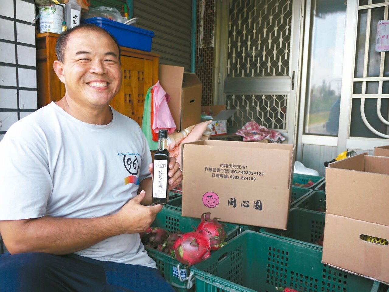 近日「同心園農場」剛上市的芝麻油成本更高。鍾紹文靦腆說,太晚採收導致成熟芝麻掉落滿地,四分農地僅收成160台斤,最後榨出135瓶芝麻油,種芝麻很耗工,採收、曝曬、敲打等工序複雜,比種稻多5至6倍人力,這批芝麻油得來不易。