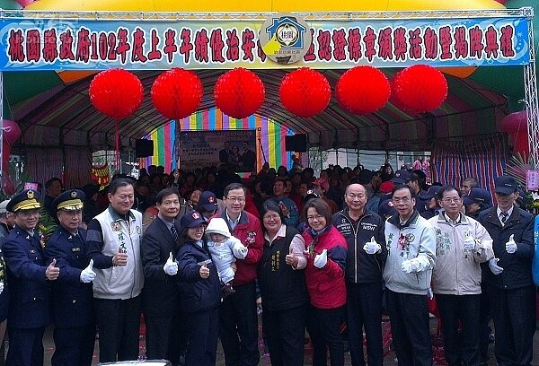 桃園縣長吳志揚、平鎮市長陳萬得、市代會主席黃農幀、縣議員羅文欽、警察局副局長林一民及上百位里民共同參與「治安示範社區」揭牌。(記者吳世傑攝)