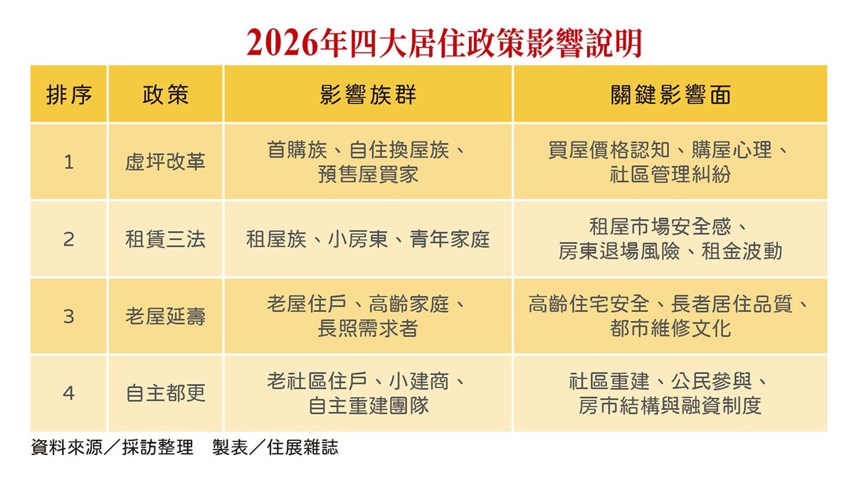 2026年,台灣居住政策將迎來一次大轉骨。多項新制將正式上路,從租屋、買屋到老屋整建,全都牽動你我的生活。